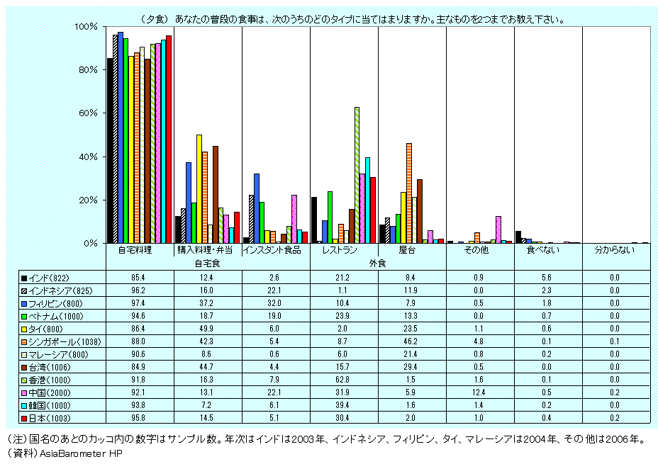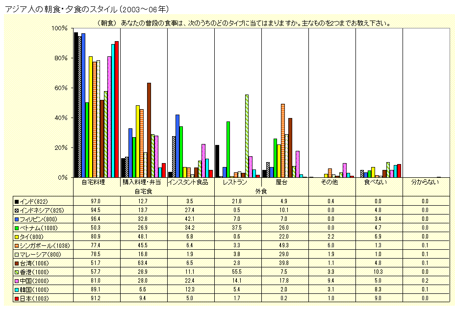 自宅で自宅料理を食べる通常の食事スタイルはどの国でも最も多くなっている。しかし、朝食では自宅で自宅料理を食べる割合が低い国もある。ベトナム、台湾、香港では50%台とかなり低い点が目立っている。 ベトナムでは、朝食を、購入料理・弁当(お店・屋台などの料理や弁当を持ち帰り自宅で食べる)やインスタント食品の自宅食、レストランや屋台での外食で済ますといった多様なスタイルをもっている。ところが、夕食に関しては、ベトナムでも自宅料理の自宅食が中心である。 台湾では、朝食を購入料理・弁当、及び屋台で摂る比率が大きい。台湾は夕食も自宅料理の比率が朝食よりは増すが、朝食と同様に購入料理・弁当や屋台の比率も大きい。「台湾の業界団体の調査によると、台湾人の朝食、昼食の外食比率はいずれも8割以上で、3食とも外食という人も少なくない」(毎日新聞「日本発・世界のヒット商品」2013年9月22日)。このため、モスバーガーの現地法人である台湾モスが開発し、ヒットさせた台湾版「焼き肉ライスバーガー」では「しっかり満腹感を得てもらおうと、日本版よりコメは2割ほど増やした」(同)という。 香港では、朝食も夕食もレストランで食する割合が、最も多く、香港人はレストラン大好き国民である点が特徴となっている。年齢別、所得別、朝食・夕食別のレストラン利用割合を図録8038に掲げておいたので参照されたい。 タイでは、朝食、夕食のいずれにおいても、購入料理・弁当を自宅で食べる割合が、1位〜2位と多くなっているのが特徴である。また、フィリピンでは、タイと同様に購入料理・弁当の自宅食が多いほか、インスタント食品の自宅食が多くなっており、このパターンがアジアの対象国の中で最も多くなっている。インスタント食品好きという点では、インドネシアも朝食、夕食ともに多い。インドネシアでインスタント・ラーメン(即席麺)の1人当たり消費量が韓国に次いで多いのもこうしたスタイルが定着しているためだと考えられる(図録0445参照)。 アジアの特色はやはり屋台食である。屋台食といっても「朝だけ屋台食」(中国、ベトナム)と「朝夕屋台食」(マレーシア、台湾、シンガポール、タイ)という2パターンがある。シンガポールは朝夕5割近くと非常に多くの人が屋台を利用しており、アジア随一の屋台大国の名に恥じない結果である。女子人口が少ない新興移民都市だったシンガポールでは、生活の基礎を築くために、男も女も働かなければならなかったため、家庭には食事の準備をするものがおらず、外食でまかなう以外の方法がなかった。このため、外食文化がねづき、誰もが、安く食事できる屋台が増えていったといわれる。もっともシンガポールは都市国家なので高く出ている面もあり、タイやマレーシアでも首都だけとれば屋台食の比率はもっと高くなろう。 ![]() このようにアジアでは、特に都市部では購入料理や屋台食が普及しているので、自宅の調理設備も簡便となっており、インスタント・ラーメン(即席麺)をつくるのさえ面倒がる人が多いことから、電気器具のシャープがインスタント・ラーメンづくりに特化した電子レンジをタイで売り出し、これがヒットしているらしい(毎日新聞「日本発・世界のヒット商品」2014年1月19日)。